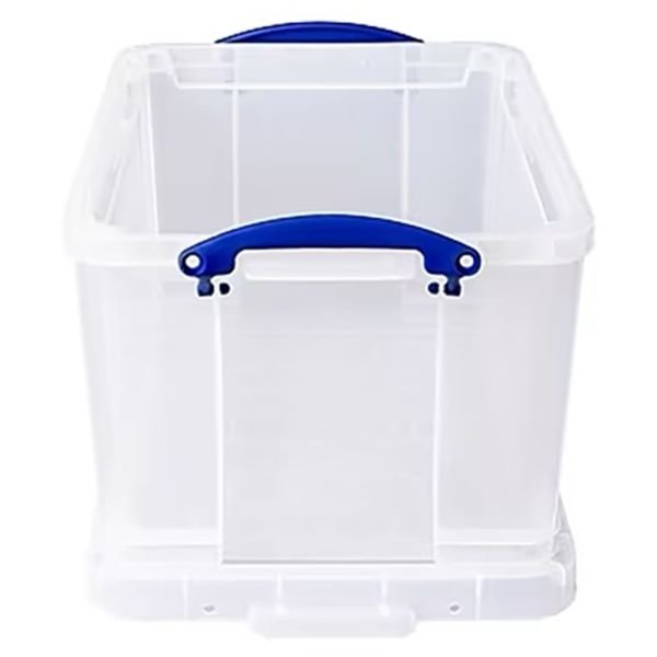 Really Useful Box Plastic Storage Container With Built-In Handles And Snap Lid, 32 Liters, 19″ x 14″ x 12″, Clear