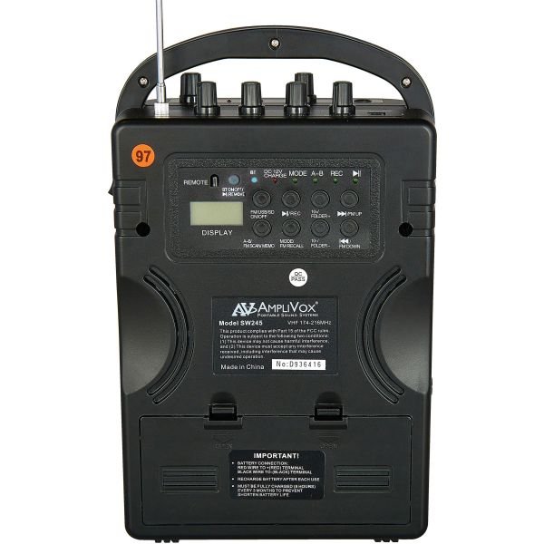 - Built-in single channel VHF wireless microphone system featuring one handheld microphone, one belt-pack transmitter with a lapel microphone (only one wireless microphone can be used at any given time).