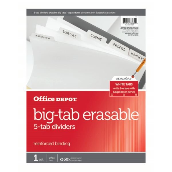 20% Recycled Erasable Big Tab Dividers, 5-Tab, White – Larger tabs hold more information for more detailed labeling
