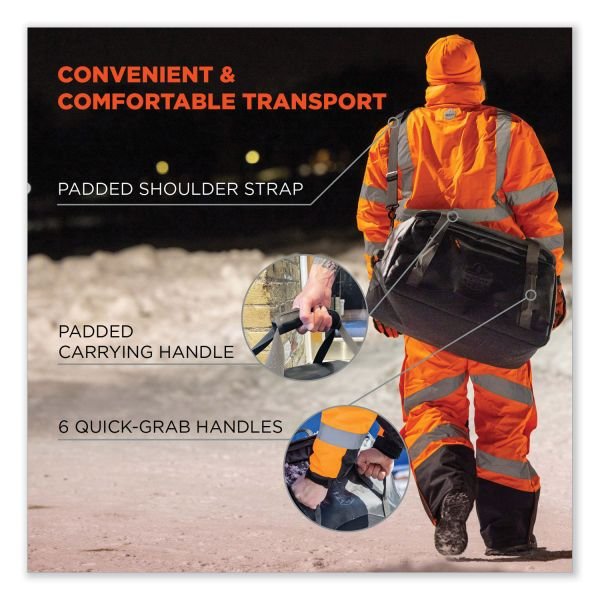ergodyne Arsenal 5031 Water-Resistant Duffel Bag, Small, 12.2 x 23.2 x 12.6, Black – The Arsenal 5031 Water-Resistant Duffel Bag is built tough to withstand harsh conditions, with heavy-duty cold- and water-resistant tarpaulin and 600D coated polyester to keep gear dry and protected in any season. Durable zippers on the top clamshell opening are also covered by an overhang to prevent water from leaking inside. A padded shoulder strap and top handle makes it comfortable to transport heavy gear, while six handles around the sides allow for quick loading and unloading no matter which way the bag is faced. A thick reinforced base provides added protection and support to hold the bag’s shape even when empty. The large clamshell compartment opens wide for convenient access when packing or unpacking, while the squared shape of the bag helps maximize storage space. For accessory storage and organization, the main compartment features a mesh zippered top pocket, a large zippered side pocket and three elastic side pockets.