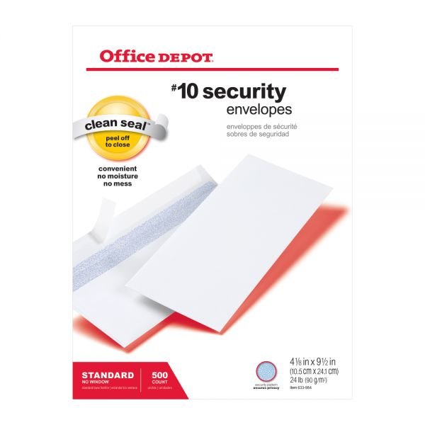 #10 Security Envelopes, 4-1/8″ x 9-1/2″, Clean Seal, White, Box Of 500 – Office Depot Brand security envelopes offer a convenient peel-and-seal design that requires no moisture.