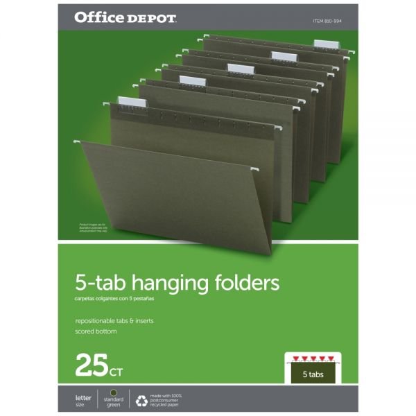 Hanging Folders, 1/5 Cut, Letter Size, 100% Recycled, Green, Pack Of 25 – Looking to reorganize your office’s drawers and cabinets with hanging files? Office Depot hanging folders highlight your eco-conscious choice and will help keep your documents organized and increase office efficiency.