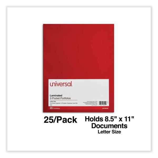 Universal Laminated Two-Pocket Folder, Cardboard Paper, 100-Sheet Capacity, 11 x 8.5, Red, 25/Box – Convenient, laminated two-pocket folder is the complete solution for business presentations, keeping all of your documents neat and organized. Laminated high-gloss covers are durable and easy to wipe clean. Die-cut business card holder on the inside keeps contact information easily accessible. Generous capacity of up to 100 sheets per folder.