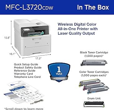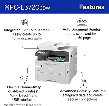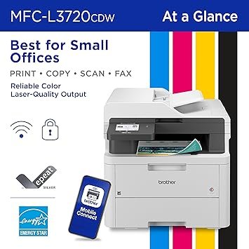 Brother Wireless MFC-L3720CDW Digital Color All-in-One Printer, Copy/Fax/Print/Scan – Best for Small Offices, the Brother MFC-L3720CDW wireless multi-function digital color printer with copy, scan, and fax functionalities consistently produces impressive, laser-quality output on every page.