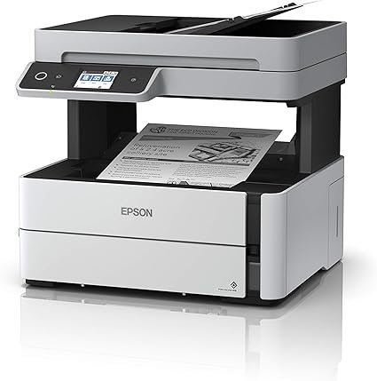 Epson EcoTank ET-M3170 SuperTank Wireless All-In-One Monochrome Printer – Process printing and copying jobs with this Epson EcoTank Supertank monochrome printer. The cartridge-free design with a supersized ink tank offers easy maintenance, while a 250-sheet paper tray and 35-page ADF support effortless scanning and faxing. This Epson EcoTank Supertank monochrome printer is powered by PrecisionCore printing technology for sharp text and graphics, and the 2.4-inch color touchscreen provides intuitive operation.