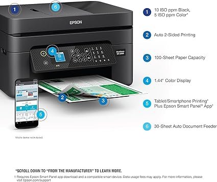Epson WorkForce WF-2930 All-In-One Color Inkjet Printer – Elevate your productivity with the Epson WorkForce WF-2930, your one-stop shop for printing, scanning, copying, and faxing. Seamlessly connect via Wi-Fi or Wi-Fi Direct, and print on the go with Epson Connect, Apple AirPrint, or Google Cloud Print. Breeze through multi-page tasks with the automatic document feeder, and save paper and costs with automatic duplex printing. Enjoy sharp text and vibrant colors with up to 4800 x 1200 dpi resolution, and navigate features effortlessly with the intuitive 1.4″ color touchscreen. Plus, fax documents, print directly from your smartphone or tablet, and fit this space-saving marvel into any home or office.