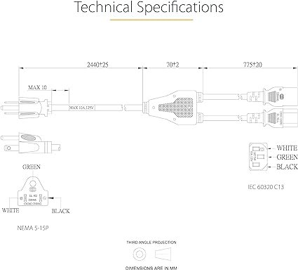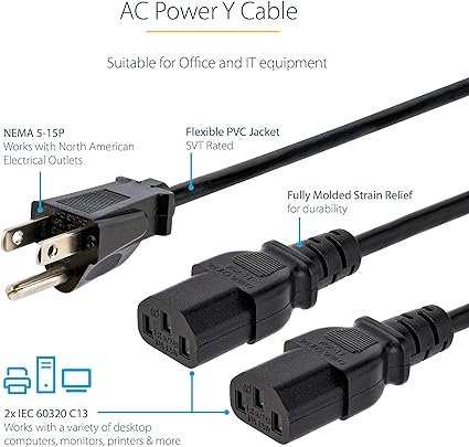 With this PC power splitter, a single NEMA 5-15R outlet can power two devices, such as computers, monitors, printers, instrument amplifiers and other equipment compatible with a C13 connector. Ideal for areas where AC outlets are limited, such as rack cabinets, this dual IEC power cable is compatible with power and extension cords.