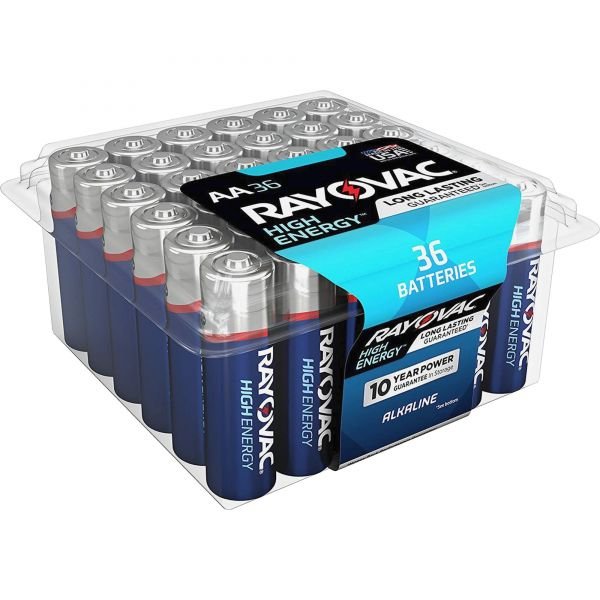 Rayovac High Energy Premium Alkaline AA Batteries, 36/Pack – Dependable power wherever you need it. Rayovac alkaline batteries last as long as the competition but cost less, providing unbeatable value. Mercury-free formula is guaranteed fresh for years.