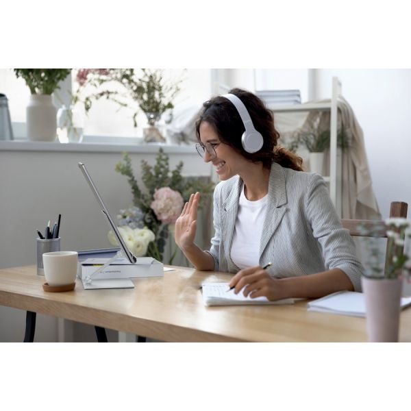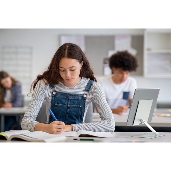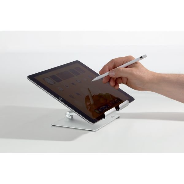 DURABLE Rise Tablet Stand – Rise Tablet Stand is a universal tablet or smartphone stand. Flexible height provides a comfortable, customizable reading, writing or drawing angle. It holds screens up to 13″ wide. Stand conveniently folds for easy storage. Nonslip, silicone pads protect surfaces against scratches. Sturdy, aluminum construction holds a maximum load capacity of 2.2 lb.