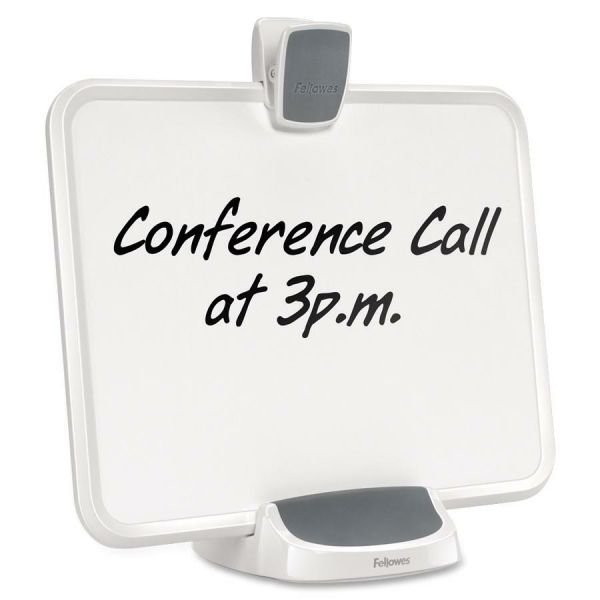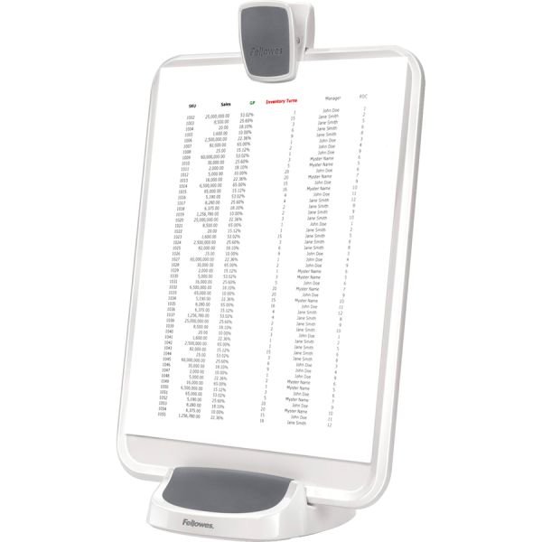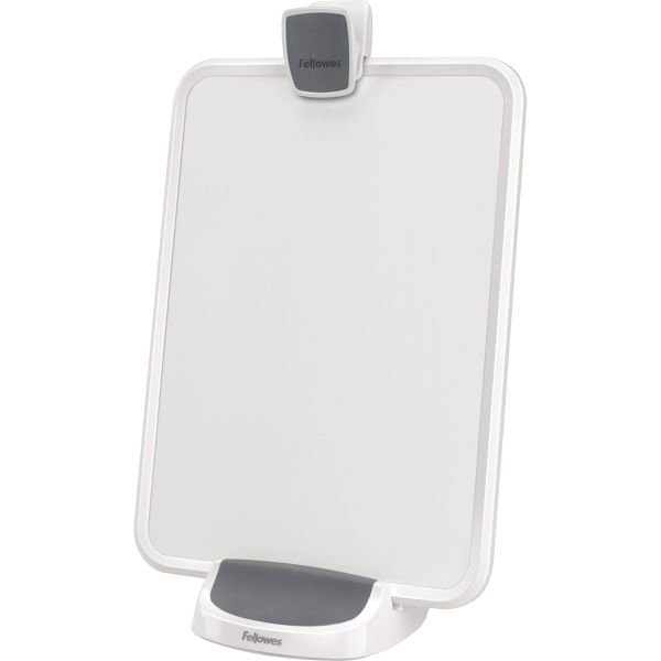 Fellowes I-Spire Series Document Lift – Copy holder, a part of Fellowes I-Spire Series, features an innovative, three-in-one design that delivers a more comfortable viewing position to help reduce neck, shoulder and eyestrain. Use in portrait and landscape orientation. The Document Lift includes a dry-erase memo board for quick notes or reminders, and offers a weighted base for added sturdiness. Copy clip holds up to 15 sheets of letter-size paper. Clip and copy holder/memo board plate are made of rubberized plastic. The base is made of cement wrapped in rubberized plastic.