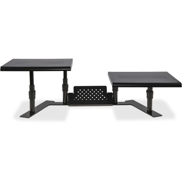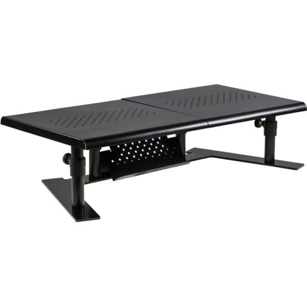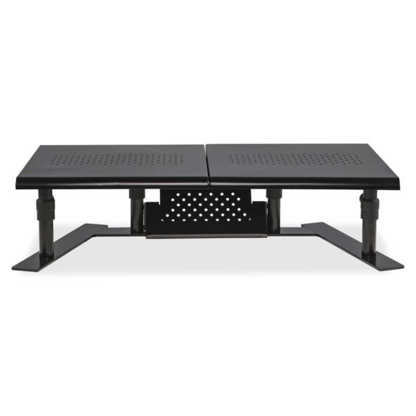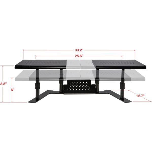 Allsop ErgoTwin Steel Dual Monitor Stand For Monitors Up To 24″, 6-2/10″H x 32″W x 14″D, Pearl Black – The Allsop ErgoTwin is an independently adjustable tabletop dual platform monitor stand that doesn’t require VESA mounts. The two platforms adjust independently and can support laptops and monitors up to 24″. Simply choose the best ergonomic viewing height for each platform, and then place your laptop or monitor on the platform. It’s that easy! Monitor platforms can be positioned together as a shelf. The vented platform surface allows for passive airflow to help keep your electronics cool, and it’s nonskid feet won’t harm your desk.