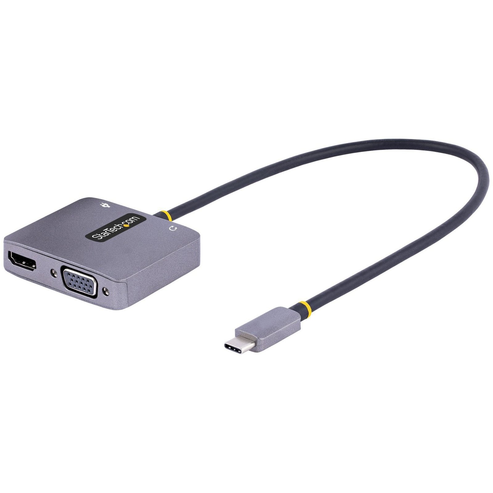 This Multiport Adapter supports a single HDMI display at resolutions up to 4K 60Hz, a single VGA display at resolutions of up to 1920×1200 60Hz or dualmirrored HDMI and VGA displays at resolutions of up to 1080p. The 3.5mm audio port can be used for connecting speakers while presenting with a VGA projector/display, or headphones. The adapter is equipped with an extralong 12 inch 30cm attached cable, providing an extended reach, to reduce port and connector strain on 2in1 devices, tablets, or laptops on risers/stands. The USB C to HDMI and VGA Adapter is bus powered for easy use while traveling. Optionally, connect a USBC power adapter and charge your laptop using the Power Delivery 3.0 passthrough feature, supporting up to 100W charging. Specifications. Adapter Type Miniphone/USBC/ VGA/HDMi. Maximum Resolution Supported 3840 x 2160. Connector on First End Details 1 x 24Pin USB Type C Male. Power Cable Length 1. Weight 1 lbs