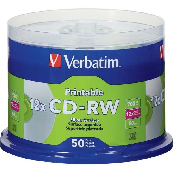 Verbatim CD-RW DataLifePlus Printable Rewritable Disc, 700 MB/80 min, 12x, Spindle, Silver, 50/Pack – With a silver inkjet printable surface qualified for high-resolution photo quality disc printing, CD-RW discs provide exceptional printing and recording performance on CD/DVD inkjet printers and duplicators. They set the standard for performance, compatibility, and reliability. These discs can be erased and rewritten to multiple times. CD-RW media is ideal for drag and drop recording using packet writing software.